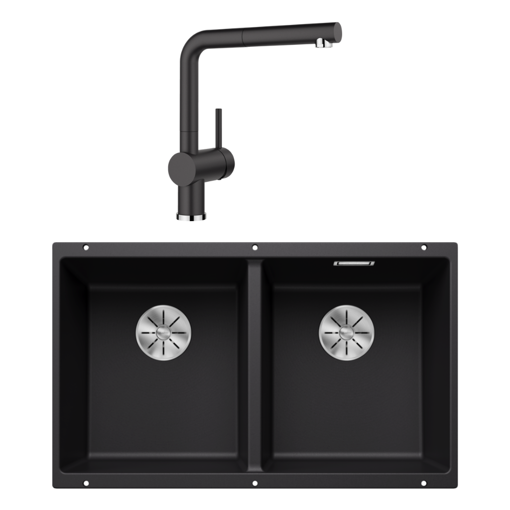 Blanco Subline Double Bowl Sink & LINUS-S Pull-Out Mixer Black SUB350350UBK5 + LINUSSB
