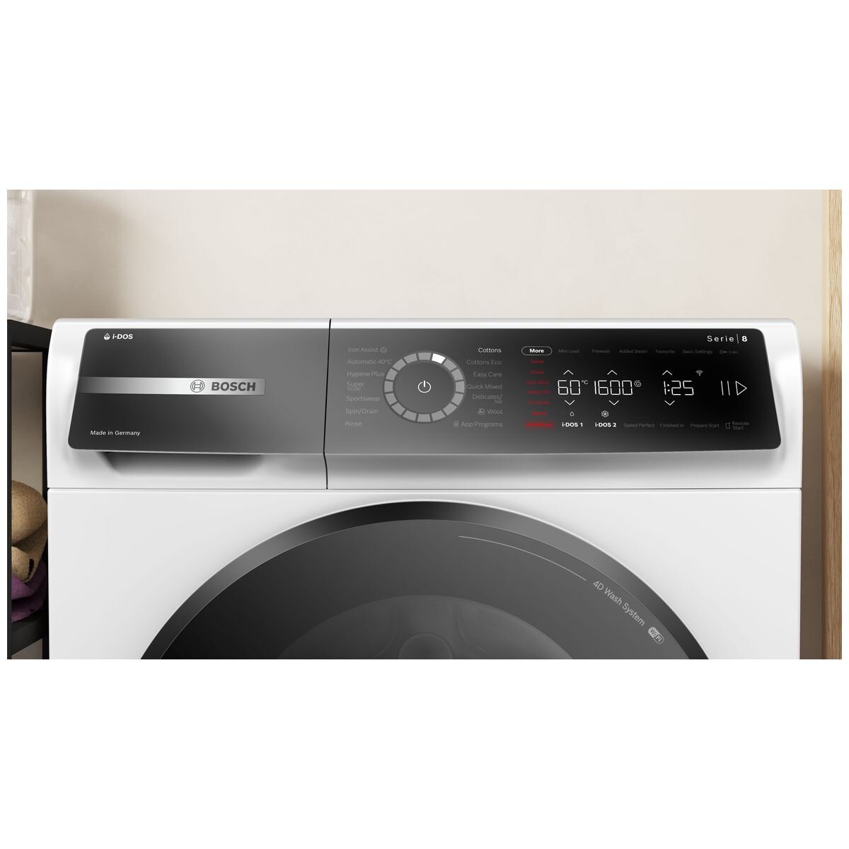 Iron Assist uses steam to relax fibres and reduce wrinkles by up to 50%, cutting down time at the ironing board, based on internal testing by Bosch. With a generous 10kg capacity, powerful 1600 RPM spin speed and Mini Load capability for single garments, the Bosch Series 8 Front Load Washing Machine with i-DOS adapts easily to daily laundry demands while maintaining quiet, efficient performance.
