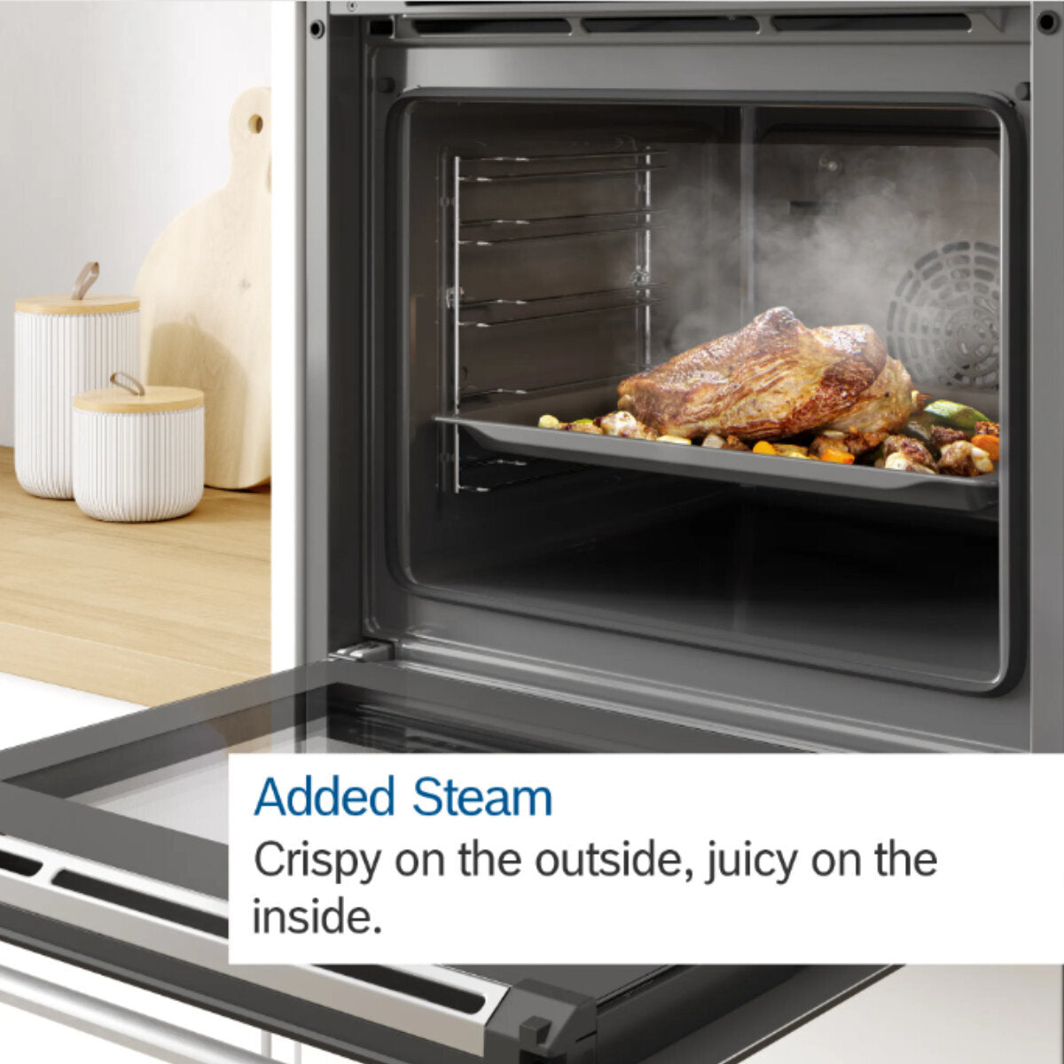 Bosch Assist, with PerfectRoast™ and PerfectBake™, uses advanced sensors to automatically set the optimal heating mode, temperature, and time depending on the kind of dish you're cooking. Bosch’s 4D HotAir will ensure that heat is distributed evenly across multiple levels. For meat that is never under- or over-cooked, use the multi-point meat probe. This probe will monitor the internal temperature of your meat during the cooking process. With the addition of steam, you can achieve roasts that are succulent, and fish that is moist and delicate. Combine steam with 12 heating methods for versatile, precise cooking.