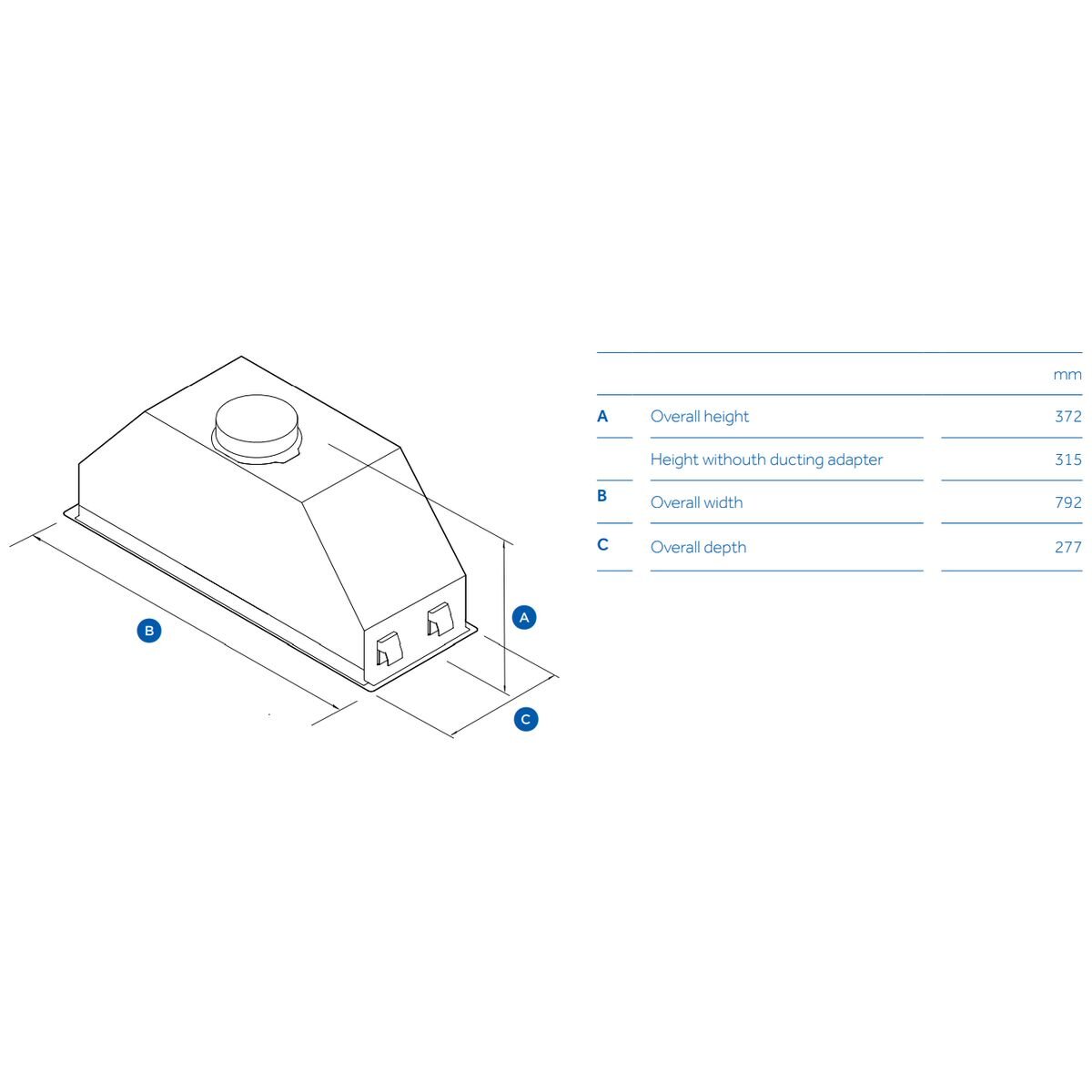 Build Type: For a minimal look in your kitchen, this Insert Undermount rangehood is 792mm wide and suited to a 900mm overhead cupboard that integrates seamlessly into the cabinetry above your cooktop.